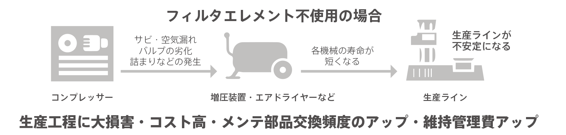 コンプレッサーと工場の各機械の間にフィルターエレメントを入れることで生産性が全体的にバランスよく向上でき、非常に大切なパーツとなっています。