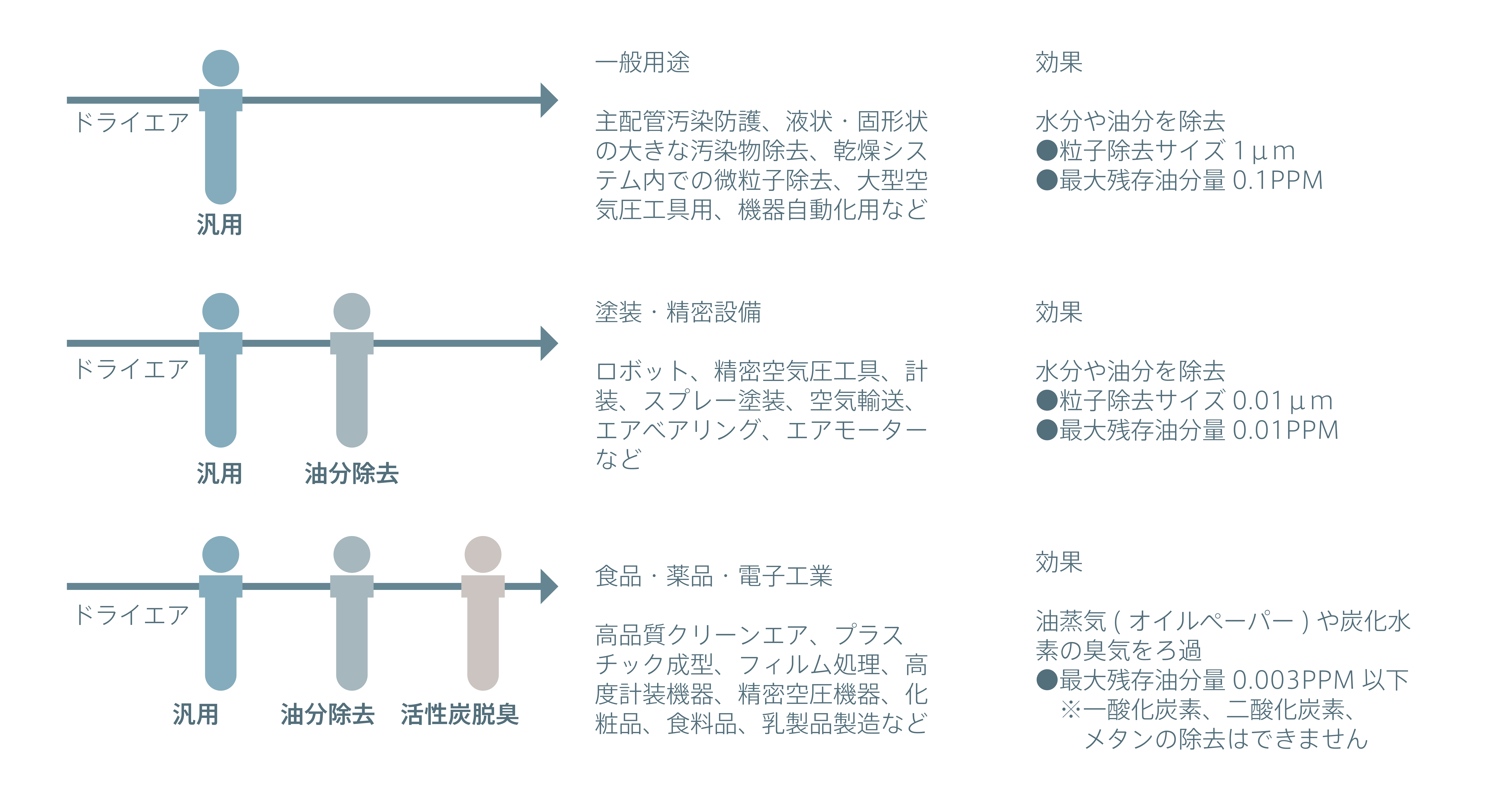 | 油分除去 | – | 0.1mg/m3 | 0.01mg/m3 | 0.001mg/m3 | 0.003mg/m3 |